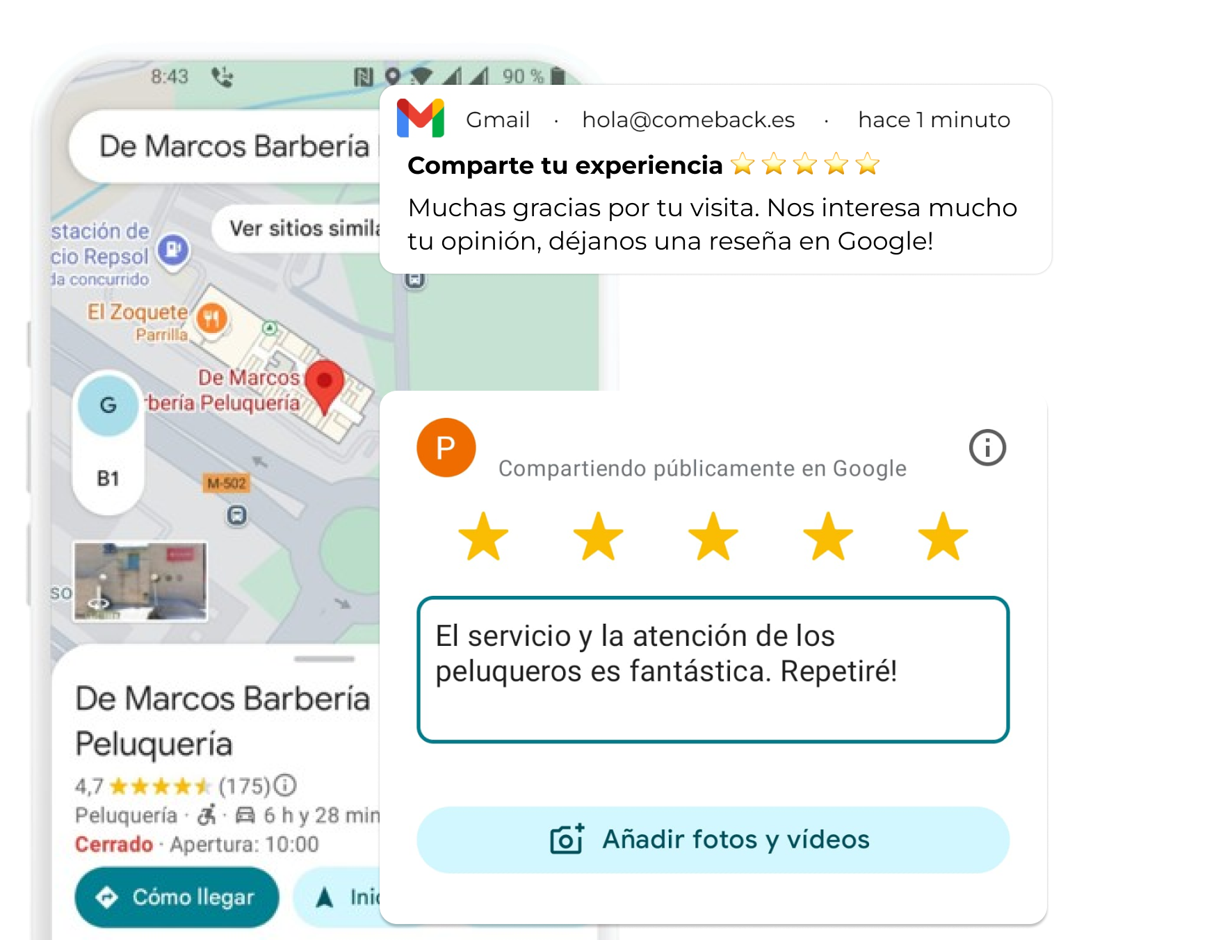 Cada vez que tus clientes te visiten les pediremos que te dejen una review de ⭐5 estrellas en Google.